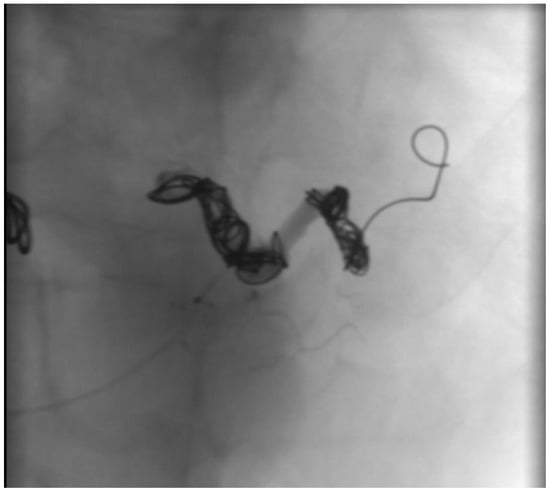 The patient presented with a severe alteration of all the coagulation parameters, and the CTA showed a huge aneurysm involving the most distal portion of the splenic artery; we thought that outright laparotomy and splenectomy would have made the hemorrhage worse. Moreover, the vascular control of the splenic aneurysm was very difficult to obtain, due to the aneurysm size and the difficulty to isolate the splenic artery. For those reasons, after a multidisciplinary evaluation involving radiologists and general and vascular surgeons, we preferred an endovascular approach, and the patient underwent emergent angiography under general anesthesia. The coeliac artery was engaged through a 6F left femoral access, and after selective angiography confirmed rupture of SA, proximal embolization with 6 detachable metallic coils (Interlock-18® and Interlock-35®, Boston Scientific, Marlborough, MA, USA), sized 8, 10, and 12 mm, was performed. The angiography showed residual bleeding from a pancreatic branch that joined the distal splenic artery in the most lateral portion of the aneurysm, so we engaged the pancreatic artery through superselective catheterization with a microcatheter and released 3 metallic coils (Interlock-18®, Boston Scientific, Marlborough, MA, USA), sized 8 mm, in the distal splenic artery and in the pancreatic artery right above its anastomosis with the splenic artery (Figure 3, Figure 4 and Figure 5). The hemorrhage was effectively controlled and final completion angiogram from the coeliac trunk showed no signs of contrast extravasation (Figure 6). The patient regained hemodynamic stability, but, due to his severely altered coagulative parameters, the prospected laparotomy to drain the intraperitoneal hematoma and prevent abdominal compartment syndrome was postponed to the following day. Meanwhile, the patient received red blood cell, fluid, and plasma integration, and remained intubated and stable throughout the night.