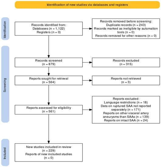 This review has several limitations. First, the heterogeneity of the data, which come mainly from case reports, case series, and portions of larger comparative studies conducted on VAAs, from which the data regarding r-SAAs and r-SAPAs were extracted. This also causes a wide heterogeneity in how results were reported and resulted in us excluding many studies in which the specific outcomes of r-SAAs and r-SAPA were not clearly provided [,,]. In fact, the largest and most interesting studies on this topic report on VAAs considered as a whole, sometimes conducting subgroup analysis by aneurysm location or by symptomatic/asymptomatic presentation; visceral artery aneurysms should be seen instead as separated identities, each with its peculiarities, because of the differences in anatomy and physiology of the abdominal organs they supply. The latest SVS Guidelines, for the first time, endeavor to provide recommendations concerning the treatment choice based on aneurysm locations, but we still need more evidence to strengthen the value of their assessments, especially in the field of ruptured VAAs. To produce high-quality evidence in this respect, reviews and metanalysis should rely on better quality primary studies reporting separately the outcomes of each aneurysm type and distinguishing between intact and ruptured VAAs [].