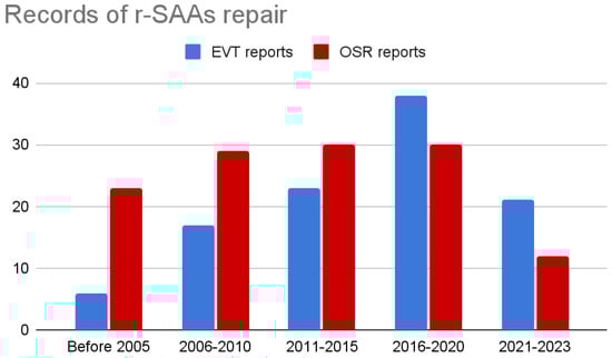 It is known that peri-operative mortality of r-SAAs and r-SAPAs is extremely high, ranging between 20% and 30%, with a considerable risk of fetal and maternal death if rupture occurs during pregnancy []. For this reason, urgent endovascular repair is considered a promising possibility to decrease intraoperative mortality, complications, and length of in-hospital stay, but the current data have failed to show better outcomes in the treatment of r-SAA and r-SAPA, and hemodynamic instability is still seen as a setting in which the open approach should be preferable [,]. On the other hand, there are many reports in the current literature that describe successful endovascular treatment of ruptured splenic arteries, and their number is growing in frequency in the latest years, as Figure 10 indicates. The uncertainty on this subject is also caused by the rare occurrence of SAAs presenting with rupture and the heterogeneity in outcomes of specific studies reporting on the post-operative outcomes of their urgent repair, which is the goal of this review.