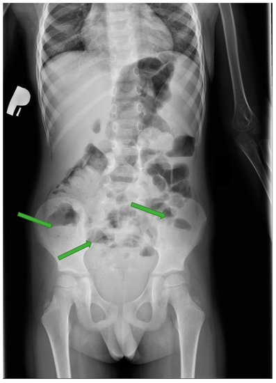 A five-year-old male patient presented to the Pediatric Emergency Department (ED) due to severe abdominal pain. Since three months prior to admission to the hospital, the patient had periodically been suffering from constipated stools, which were mostly passed daily, but with increased hardness. Over the past three months, there had been three episodes when the boy did not pass stool for a week. During these times, an increase in paroxysmal abdominal pain was observed. The boy was then treated with trimebutine prescribed by the general practitioner. Three days before his admission to the hospital, the child had passed stool for the last time, and abdominal pain had intensified. In primary care, trimebutine and macrogol therapy were ordered, but due to the lack of improvement, the mother took her child to the ED for the first time. During this visit, the child underwent an examination by a pediatrician and had an enema performed. At that time, the boy’s condition improved, and the child was discharged home. On the next day, the mother and the boy were again admitted to the ED, because the child had developed severe abdominal pain since the morning hours.