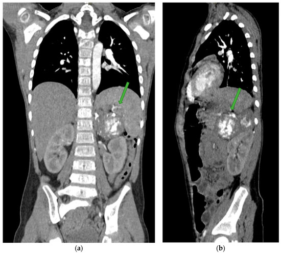 CECT scan of the chest and abdomen showing a visible irregular, heterogeneous lesion within the left hypochondrium (green arrows). (a)—frontal section. (b)—sagittal section.