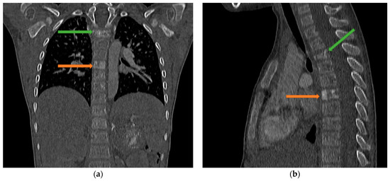 CECT scan of the chest and abdomen showing a sclerotic lesion of T3 (green arrow) on the frontal section (a) and a wedge-shaped deformity of T3 on the sagittal section (b) and a sclerotic lesion of T6 (orange arrow).