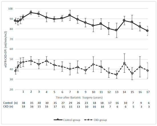 eGFR evolution after bariatric surgery for study groups. Data are shown as mean ± standard error.