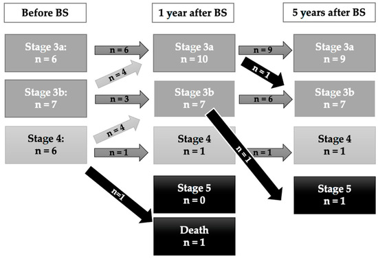 It should be strengthened that although the mortality rate was clearly higher in the CKD group, it was not an immediate consequence of BS. It is well-known that life expectancy is reduced for all levels of renal function below an eGFR of 60 mL/min/1.73 m2. Actually, CKD has been referred to as a silent and poorly known killer [48]. This higher risk of premature death is principally related to an increase in CV morbidity, as observed in our cohort [49].