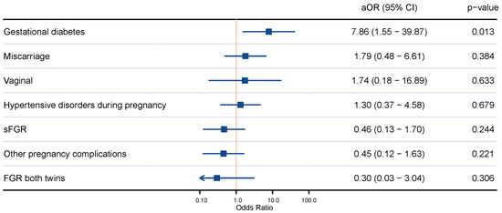 R version 4.0.3 (The R Foundation for Statistical Computing) was used for the statistical analysis. Quantitative data are shown as mean and interquartile range, while categorical data are presented as absolute and relative frequencies. Comparisons between the characteristics of the groups were performed using Student’s t-test or Kruskal–Wallis test for continuous variables, and Fisher’s exact testing for categorical variables. Multivariable logistic regression analyses were used, and the adjusted odds ratio (aOR) and the 95% confidence interval (CI) are reported. The odds ratios were adjusted by maternal age, nulliparity, body mass index, and smoking habit.