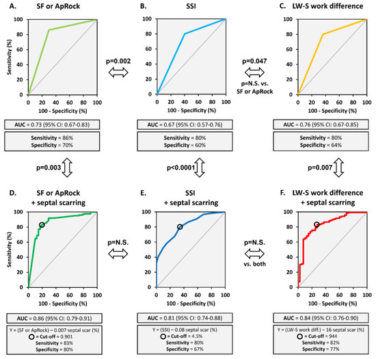 Presence of mechanical dyssynchrony, combined with septal scarring, identifies CRT response. ROC curve displaying as predictors of CRT response. Top row: markers, not combined with septal scarring info, (A) SF or Aprock, (B) SSI, and (C) LW-S work difference. Bottom row: markers combined with septal scarring info, (D) SF or ApRock + septal scarring, (E) SSI + septal scarring, and (F) LW-S work difference + septal scarring. Statistical differences between plots are indicated.