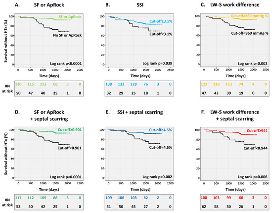 Presence of mechanical dyssynchrony, combined with septal viability, predicts survival without heart transplant (HTx). Kaplan–Meier curve stratified according to the presence of mechanical dyssynchrony. Top row: markers, not combined with septal scarring info, (A) SF or ApRock, (B) SSI, and (C) LW-S work difference. Bottom row: markers combined with septal scarring info, (D) SF or ApRock + septal scarring, (E) SSI + septal scarring, and (F) LW-S work difference + septal scarring.