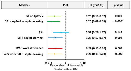 Mechanical dyssynchrony presence, combined with septal viability, reduces the hazard of death or heart transplant (HTx). Cox regression model with hazard-ratio (HR) for the presence of SF or ApRock (light green line, row 1) + septal scarring (dark green line, row 2), SSI (light blue line, row 3) + septal scarring (dark blue line, row 4), and LW-S work difference (red line, row 5) + septal scarring (yellow line, row 6).