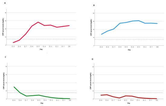 Four CRP kinetic patterns were defined after non-linear mixed-effects modeling to the individual CRP kinetic profiles, using as a cutoff value point for infection a previously identified value of 8.7 mg/dL (Figure 1) [28]. Pattern A was defined by a Day 0 CRP serum level > 8.7 mg/dL and if, in the previous days, it was detected to be below that cutoff value at least once. Pattern B was assumed if the serum CRP level was consistently above 8.7 mg/dL until Day 0. Pattern C was defined when the serum CRP level was <8.7 mg/dL at Day 0 and was detected to be above that value at least once in the previous days. Finally, Pattern D occurred when the CRP serum level was persistently <8.7 mg/dL at all evaluations.