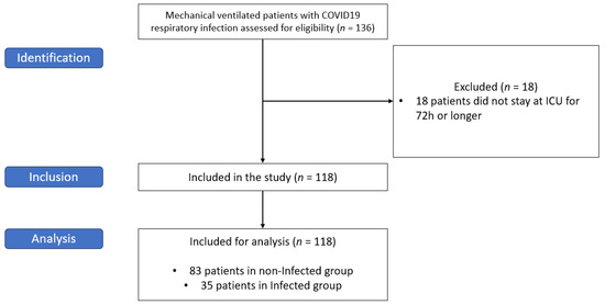 A total of 136 patients were eligible for the study. Of these patients, 18 patients did not stay at ICU for 72 h or longer and were excluded for statistical analysis. The remaining 118 patients were included, 83 (70.3%) patients in the non-infected group and 35 (29.7%) in the infected group (as depicted in Figure 2). Patient baseline demographic and primary clinical characteristics are summarized in Table 1. The cultures and microbiological identification rates are depicted in Table S1.