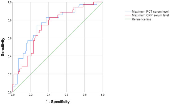Receiver operating characteristic curves were plotted for the maximum CRP and maximum PCT registered. The accuracy of these variables was assessed by calculating the area under the curve (AUC).