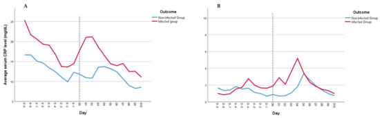 Time-dependent analysis of CRP (Figure 4A) showed a significant increase in this biomarker in the 48 h before the day of infection diagnosis, whereas the CRP level in non-infected patients remained almost unchanged and steady during the days before the event of interest (p = 0.009). On the other hand, PCT serum levels were not different between the two groups (p = 0.857) (Figure 4B).