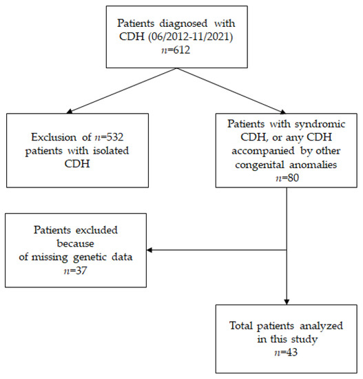 In the period of 06/2012 to 11/2021, n = 80 newborns with CDH+ were treated at our hospital. aCGH results could be obtained from n = 43 patients, of whom 16 (37.2%) were male and 27 (62.8%) were female. Figure 1 visualizes the screening process for the study set-up.