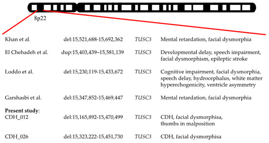 - El Chehadeh, S.; Bonnet, C.; Callier, P.; Béri, M.; Dupré, T.; Payet, M.; Ragon, C.; Mosca-Boidron, A.L.; Marle, N.; Mugneret, F.; et al. Homozygous truncating intragenic duplication in TUSC3 responsible for rare autosomal recessive nonsyndromic intellectual disability with no clinical or biochemical metabolic markers. JIMD Rep. 2014, 20, 45–55. [Google Scholar]