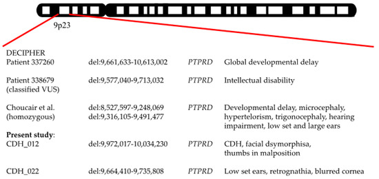 Suspicious results involving a partial deletion of approximately 304,607 kb and 128,508 kb, respectively, located at 8p22 affecting TUSC3 could be obtained from two female patients (CDH_012 and CDH_026) (Figure 3). In each case, the hernia was located on the left side and both neonates exhibited facial anomalies in addition. Both suffered from severe pulmonary hypertension and died after 4 and 6 days of hospitalization, respectively. Furthermore, patient CDH_012 exhibited another heterozygous deletion within the region of 9p23 (9,972,017-10,034,230 kb) (Figure 4) encompassing the Protein Tyrosine Phosphatase Receptor Type Delta gene (PTPRD) classified as a variance of unknown significance. Additionally, this gene was also partially deleted in another female preterm neonate (CDH_022; 9,664,410-9,735,808 kb) with right-sided CDH. She also showed facial dysmorphic features including low set ears, retrognathia, and corneal opacity.