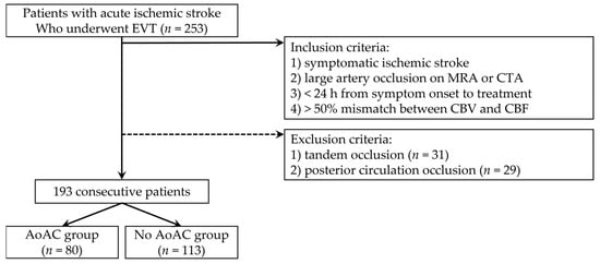 We retrospectively collected data from patients who underwent EVT for AIS at our hospital between January 2017 and December 2021. The inclusion criteria were as follows: (1) symptomatic AIS, (2) large vessel occlusions confirmed using magnetic resonance (MR) angiography or computed tomography (CT) angiography, (3) less than 24 h from symptom onset to treatment, and (4) at least one-half mismatch between cerebral blood flow and cerebral blood volume map with MR perfusion imaging. A total of 253 patients who met the inclusion criteria were included. From the 253 patients, 60 were excluded because of (1) tandem occlusions (n = 31) and (2) posterior circulation occlusions (n = 29). Eventually, 193 consecutive patients were included (Figure 1).