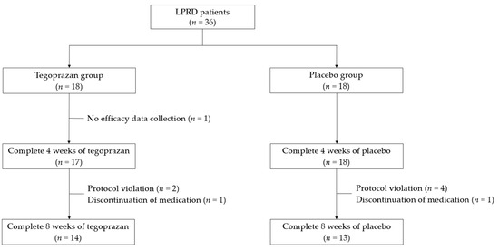 Recently, potassium-competitive acid blockers (P-CABs) have been suggested as an effective treatment for acid-related diseases [16]. Tegoprazan is a novel, potent, and highly selective P-CAB that was developed in Korea [17]. Unlike PPIs, which need chemical transformation into the active form and bind covalently to the gastric H+/K+-ATPase, tegoprazan inhibits H+/K+-ATPase reversibly in a K+-competitive manner without the need for any conversion. In addition, it blocks the active and inactive forms of proton pumps. Accordingly, tegoprazan inhibits gastric acid secretion with a rapid onset of action and leads to the prolonged control of gastric acidity [17,18]. In recent clinical trials, tegoprazan showed non-inferior efficacy in healing erosive esophagitis, tolerability similar to that of esomeprazole [19,20], and superior therapeutic efficacy compared with placebo in patients with non-erosive reflux disease (NERD) [21]. Thus, tegoprazan may have a better therapeutic effect in acid-related disorders, including LPRD. Therefore, this preliminary study aimed to evaluate whether an 8-week treatment with tegoprazan once daily significantly reduces LPRD symptoms and signs compared with placebo in patients with LPRD.
