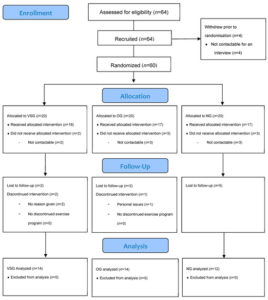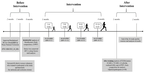 After excluding participants who dropped out of the study during the exercise program due to personal reasons the total number of participants was n = 40. We then categorized them into three groups: the vascular stiffness group (VSG, n = 14), obesity group (OG, n = 14), and normal group (NG, n = 12). The measurements and test results of these groups were subsequently analyzed. Prior to the study, approval was obtained from the Pusan National University Institutional Review Board (PNU IRB/2022_44_HR). Detailed explanations of the study purpose and goals were provided to the participants, and signed consent was obtained from those who voluntarily agreed to participate. The study procedures and the physical characteristics of the participants are presented in Table 1 and Figure 1.