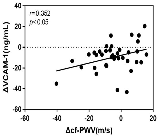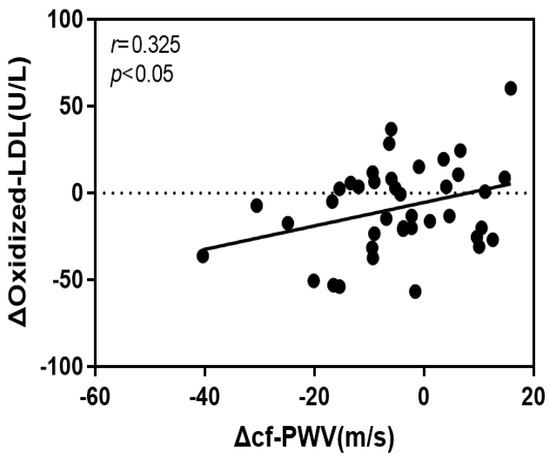 The rate of change of cf-PWV in this study had a significant positive correlation with that of VCAM-1 (r = 0.352, p < 0.05) and oxidized LDL (r = 0.325, p < 0.05). Figure 3 and Figure 4 show the respective scatter plots.