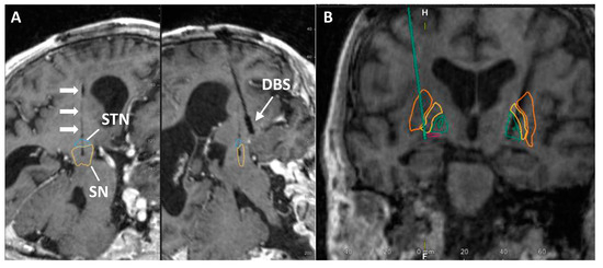 As part of a safety, feasibility, and tolerability clinical trial, participants successfully received standard-of-care bilateral DBS with electrodes targeting the GPi and unilateral PNT implantation to either the SN or NBM (Table 2) [29]. Participants were actively followed for 2 years (Table 2) under the study protocol, except for PD2, who died from unrelated complications following a fall and pneumonia prior to completing the two-year visit. We did not observe any serious adverse events related to the study intervention in participants, and PD1, PD4, and PD5 died from non-study related events; i.e., complications related to PD: bowel obstruction, pneumonia, and pulmonary arrest, respectively. Representative MRI images of PNT placement either in the SN (A) or in the NBM (B) are shown in Figure 1 below.
