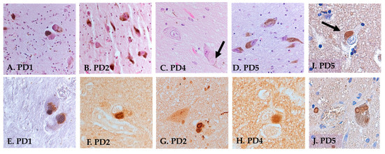 Neuropathology of PD1–5. (A–D) H&E staining of the SN in PD1, 2, 4, and 5. Note loss of neuronal cell bodies and neuromelanin, as well as LBs. (E–J) α-synuclein immunohistochemistry demonstrating LBs in various brain regions. (E) SN of PD1; (F) amygdala, PD2; (G) LBs in the LC of PD2; (H) temporal cortex LBs in PD4; (I) amygdala in PD5; (J) LC in PD5. Note cortical and subcortical LBs in all participants examined. Black arrows in C and I point to Lewy Bodies.