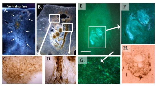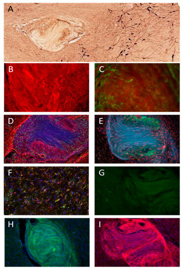 Immunohistochemistry: Paraffin-embedded sections were deparaffinized and pre-treated for antigen retrieval. For neuropathological staging, Bielschowsky silver staining and hematoxylin and eosin routine staining, as well as immunohistochemical staining, were performed in cortical and subcortical brain regions using primary antibodies directed against tyrosine hydroxylase (TH) (cat: AB113, Abcam Inc., Cambridge, MA, USA, 1:100), alpha-synuclein (cat: AB5038, Millipore, Darmstadt, Germany, 1:250), p75 neurotrophin receptors (p75NTR, cat: MAB367 R&D Systems, Wiesbaden, Germany, 1:250), amyloid beta 1-42 (Millipore, cat: AB5078P, dilution 1:100), and AT8 (cat: MN1020, Thermofisher, Waltham, MA, USA, 1:250). Endogenous peroxidase activity was blocked by a 7:2:1 ratio of TBS, MeOH, and 3% hydrogen peroxide (H2O2), respectively, followed by incubation with 100 mM sodium metaperiodate. Sections were blocked with TBS containing 0.25% Triton-X and 10% normal serum for 1 h and then incubated overnight with the primary antibody. After washing, sections were incubated with biotin-conjugated secondary antibodies, washed in PBS, incubated with streptavidin-horseradish peroxidase (HRP) complex, visualized using a 1 mg/mL 3′,3′-diaminobenzidine (DAB) solution containing 0.02% H2O2, dehydrated, and cover-slipped.