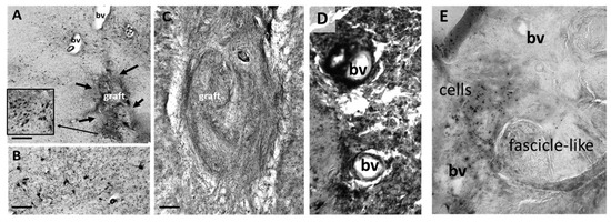 (A,B) p75 NTR immunostaining of the PD2 graft and surrounding NBM. Note a dense pattern of p75-stained cell bodies within the graft (arrows and inset in (A)), along with immunostained neuronal cell bodies in the overlying NBM (B). In (C), routine staining of the PD2 graft shows the distinct morphology of the graft at 29 months post-grafting, with both islands of cell bodies and streamlined tissues resembling fascicles (see also (E)). Scale bars represent 200 microns (A), 75 microns (B), and 100 microns (C). H&E staining shows numerous blood vessels (bv) in PNT grafts (D,E).