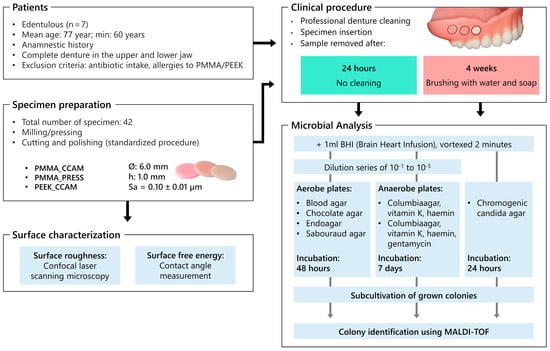 Study design; CAD/CAM-processed polymethyl methacrylate (PMMA_CCAM); heat-pressed polymethyl methacrylate (PMMA_PRESS); CAD/CAM-processed polyether ether ketone (PEEK_CCAM); number (n); diameter (ø); height (h); arithmetical mean height of surface roughness (Sa); matrix-assisted laser desorption ionization time-of-flight mass spectrometry (MALDI-TOF).