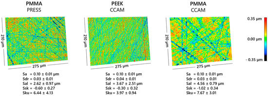 After the preparation of the specimens, all the groups resulted in an Sa of 0.10 ± 0.01 µm and an Sdr of 0.03 ± 0.01 to 0.04 ± 0.01 (Figure 2). Based on the three-dimensional surface renderings, the specimens of the PMMA_CCAM group showed a coarser ground pattern with fewer and broader as well as deeper valleys (Figure 2). Correspondingly, a higher Sal with 4.56 ± 0.79 µm and a reduced Ssk with −1.02 ± 0.34 of the surface distribution can be observed for the PMMA_CCAM samples. The Sku is greater than three for all sample groups (3.97 ± 0.94 to 7.67 ± 3.01) but varies in both mean and standard deviation.