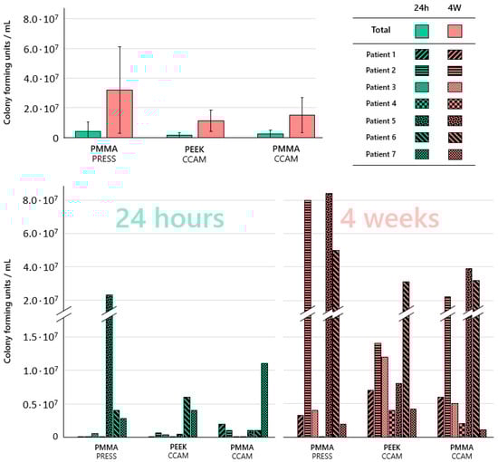 There was significantly more microbial growth on all specimens after four weeks than after 24 h (p ≤ 0.004). Higher total bacterial counts as well as larger standard deviations were identified on the specimens fabricated from conventionally processed PMMA than on the other two materials, but no statistically significant differences (p ≥ 0.211) between the three materials were determined (Figure 3).