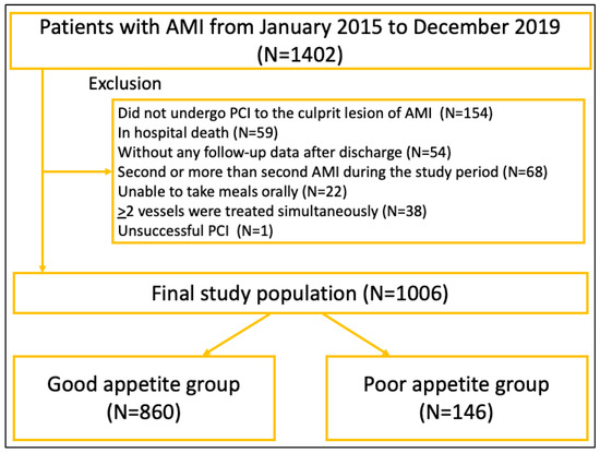 From January 2015 to December 2019, we had 1402 patients with AMI in our medical center. We excluded 396 patients according to the exclusion criteria as follows: (1) did not undergo PCI to the culprit lesion of AMI (n = 154), (2) in-hospital death (n = 59), (3) without any follow-up data after discharge (n = 54), (4) second or more than second AMI during the study period (n = 68), (5) unable to take meals orally, (6) ≥2 vessels were treated simultaneously (n = 38), (7) unsuccessful PCI (n = 1). Our final study population was 1006 patients and was divided into the good appetite group (n = 860) and the poor appetite group (n = 146). The study flowchart is shown in Figure 1.
