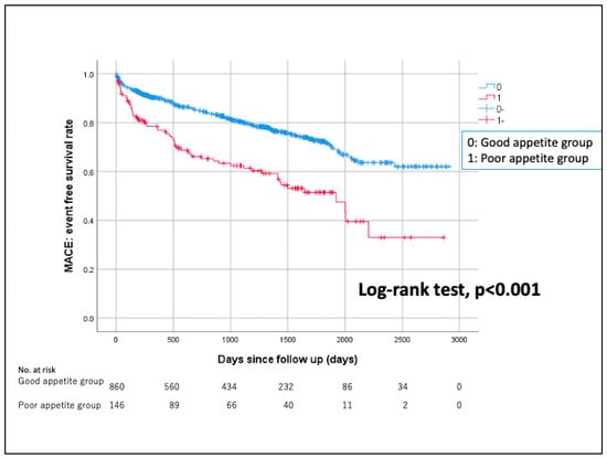Kaplan–Meier curves for MACE between the two groups are shown in Figure 2. The median follow-up duration was 996 days (Q1: 262 days–Q3: 1588 days). The incidence of MACE was significantly higher in the poor appetite group than in the good appetite group.