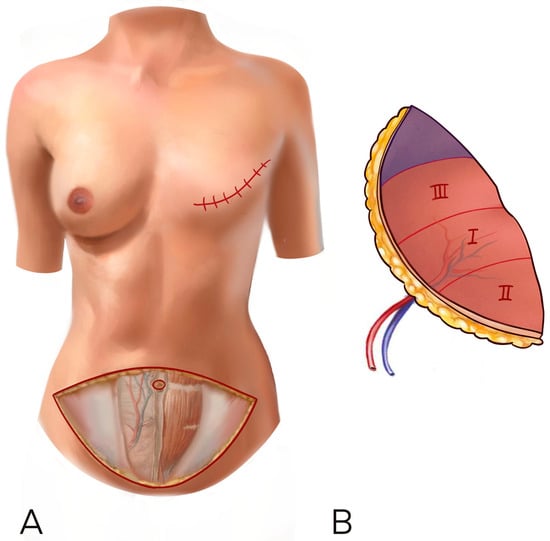 - Patel, A.J.; Kulkarni, M.; O’Broin, E.S. A TRAM flap design refinement for use in delayed breast reconstruction. J. Plast. Reconstr. Aesthet. Surg. 2009, 62, 1135–1139. [Google Scholar] [CrossRef]