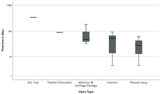 The most severe injury subtypes were ACL tears, patellar dislocations, meniscus and cartilage injuries, fractures, and physeal injuries, which were associated with longer mean time-loss (Figure 1).