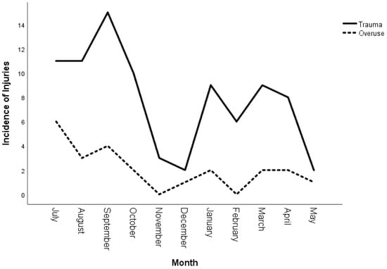While overuse injuries occurred mainly in the pre-season in July, traumatic injuries occurred primarily in the early championship in September and January (Figure 2).