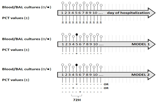 Design of the study and models of analysis. Legend—PCT: (+) positive, (−) negative. Blood cultures: ○ normal value, ● pathological value.