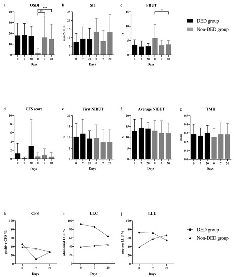 Comparisons of DED parameters before SMILE and on day 7 and day 20 after surgery. OSDI scores (a), SIT (b) and FBUT (c) values in DED patients did not show any significant changing trends before and after surgery. However, an increased OSDI score and significant FBUT reduction were found in non-DED subjects. SIT values in non-DED patients decreased on day 7, and recovered on day 20 without significant difference. The alterations of CFS score (d) in both groups did not have any statistically significant differences. The proportion of eyes with positive CFS (h) gradually decreased in non-DED group after surgery, while decreased on day 7 and increased on day 20 in DED group. Comparisons on the first NIBUT (e), the average NIBUT (f) and TMH (g) before and after surgery did not find any significant differences in both two groups. Non-DED eyes showed an increasing proportion of abnormal LLC (i) and uneven LLU (j) after SMILE, which were decreased in DED eyes. * p < 0.05, ** p < 0.01 and *** p < 0.001. DED, dry eye disease; OSDI, ocular surface disease index; SIT, Schirmer I test; FBUT, fluorescein tear film breakup time; CFS, corneal fluorescein staining; NIBUT, non-invasive breakup time; TMH, tear meniscus height; LLC, lipid layer color; LLU, lipid layer uniformity (LLU).