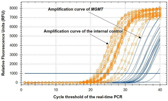 MGMT methylation analysis using the Epi-TOP MPP assay. y-axis: Relative fluorescence units (RFUs) of each fluorescence channel. x-axis: Cycle threshold of the real-time PCR. Orange curve (ROX fluorescence channel): amplification curve of the internal control (ACTB). Orange line: baseline threshold of the ROX channel. Green curve (HEX fluorescence channel): Amplification curve of the target gene (MGMT). Green line: baseline threshold of the HEX channel.