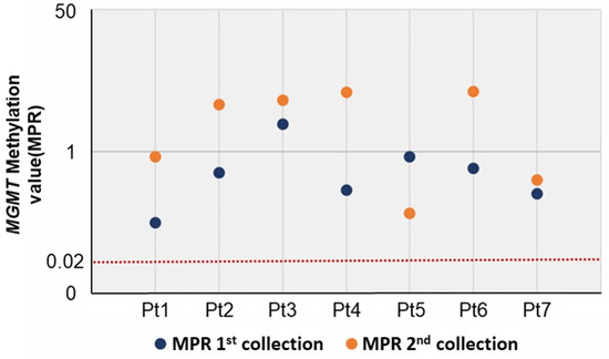 MGMT methylation values (MPR) of the 1st and 2nd collected samples from seven patients (defined unmethylated value: ≤0.02).