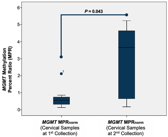 We investigated whether persistent HPV infection is associated with the MGMT methylation status and compared the MPR of the samples collected during the first and second cervical smears. To normalize the MPR level, we subtracted the MPR level of the normal samples (MGMT MPRnorm = MPR (cervical samples at the 1st or 2nd collection) − MPR (0.02)). We then compared the MGMT MPRnorm of the samples from the 1st collection with that for the samples from the 2nd collection. Our data show a correlation between the MGMT methylation status at the beginning of the study (1st collection) and ≥6 months later (2nd collection) (p = 0.043) (see Figure 3).