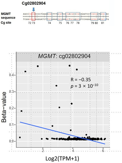 We examined the correlations between MGMT methylation and mRNA using data from TCGA database. The methylation status of the MGMT CpG probe (cg028202904) utilized in the Epi-TOP MPP assay for public data analysis was also assessed. Our findings indicate that the MGMT mRNA expression levels were significantly and negatively correlated with methylation at cg028202904 (see Figure 4).