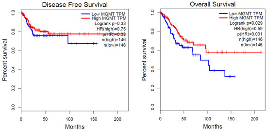 Next, to determine whether MGMT methylation has any clinical significance, we analyzed the survival of cervical cancer patients using the online tool Gene Expression Profiling Interactive Analysis (GEPIA; http://gepia.cancer-pku.cn) (accessed on 17 November 2022). As seen in Figure 4, we observed a negative correlation between MGMT methylation and MGMT mRNA expression levels. To further evaluate this clinically, we utilized MGMT expression and cervical cancer survival data from TCGA. According to the analysis conducted by GEPIA, a significant association was found between downregulated MGMT mRNA expression at the transcriptional level and poor overall survival (p = 0.029, log-rank test) in human cervical cancer. However, the association between MGMT mRNA expression and disease-free survival (DFS) did not show statistical significance (p = 0.33) (refer to Figure 5).