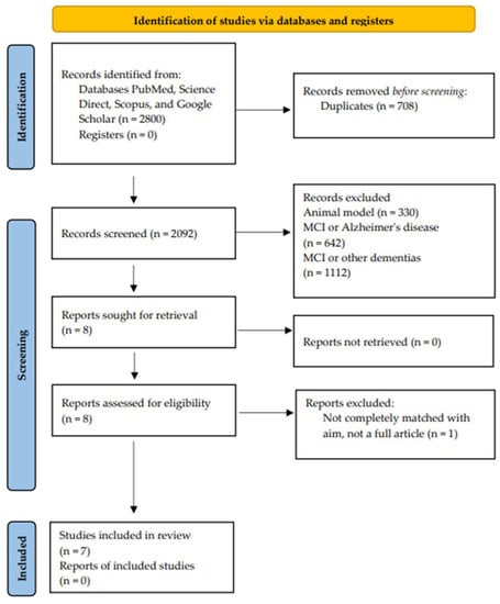 The results of the initial database search were 2800 manuscripts. Duplicate records (n = 708) were eliminated, and records were arranged with titles, abstracts, and original reports (n = 2092). Following a full-text screening, the main exclusion factors were animal research and cohorts of patients with MCI or Alzheimer’s disease/other dementias (n = 2084), not completely matched with aim and not a full article (n = 1). Seven full-text papers that fulfilled the predefined inclusion and exclusion criteria were included in the final synthesis. The study’s inclusion is described in the PRISMA flowchart (Figure 1).