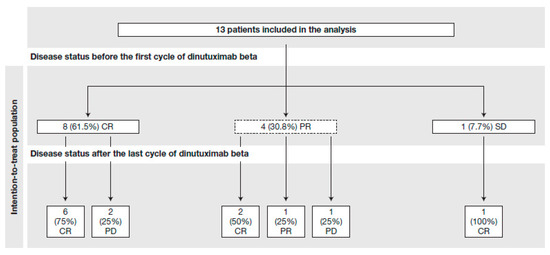 Disease status before and after dinutuximab beta treatment. CR, complete response; PD, progressive disease; PR, partial response; SD, stable disease.