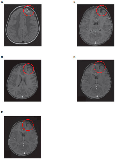 Axial view of brain MRI scans from a patient with neuroblastoma (patient 11) showing intracranial left-frontal metastases at (A) initial relapse, (B) after reinduction chemotherapy and radiotherapy, (C) after haplo-SCT, (D) after dinutuximab beta treatment completion, and (E) 18 months after haplo-SCT. Red circles show the site of metastases. Haplo-SCT, haploidentical stem cell transplantation; MRI, magnetic resonance imaging.