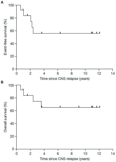 CNS relapse was defined as the appearance of a leptomeningeal or parenchymal lesion confirmed by magnetic resonance imaging (MRI). Metastases originating from the bone of the skull were only included if clear leptomeningeal spread was confirmed.