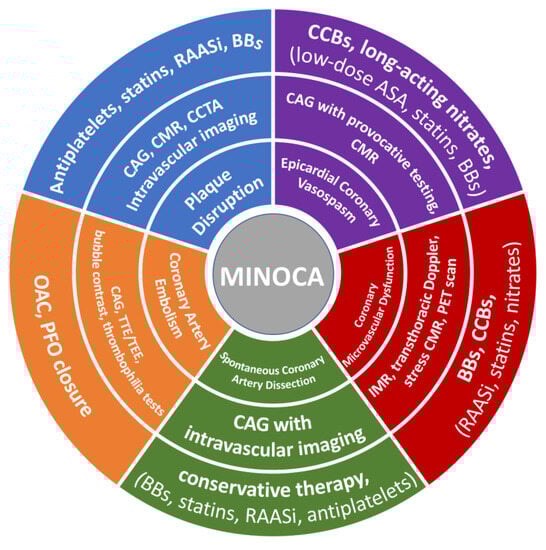 Diagnostic tools and therapeutic strategy based on the etiology of MINOCA. CAG—coronary angiogram; CMR—cardiac magnetic resonance; CCTA—coronary computed tomography angiography; ASA—acetylsalicylic acid; BBs—beta-blockers; RAASi—renin–angiotensin adrenergic antagonists; CCBs—calcium channel blockers; OAC—oral anticoagulation; PFO—patent foramen ovale; TTE—transthoracic echocardiography; TEE—transesophageal echocardiography; PET—positron emission tomography; IMR—index of microvascular resistance.