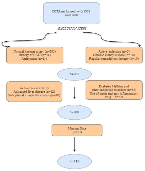 This retrospective observational study enrolled 1200 consecutive patients who presented at our outpatient clinic with stable angina pectoris and/or angina-equivalent symptoms and subsequently underwent coronary computed tomography angiography (CCTA) between June 2020 and August 2022. The pre-test probability scores of each patient, calculated based on factors, including age, gender, diabetes mellitus (DM), hypertension, smoking, dyslipidemia, and family history, were assessed [3]. The study included individuals with intermediate risk (pre-test probability: 15–85%) of CAD who underwent CCTA as a diagnostic procedure. In addition, the following criteria were applied to include subjects in the study: (i) those with suspected CAD due to symptoms such as stable angina or angina-equivalent symptoms like dyspnea and (ii) those with no history of CAD [3]. A total of 485 individuals were excluded from further analysis as they met at least one of the following criteria: known normal coronary artery anatomy, a history of CAD, atrial fibrillation, atrial flutter, atrioventricular block, presence of implantable intracardiac devices, severe valvular disorders, diabetes mellitus (DM) or other endocrine disorders, use of antihyperlipidemic medication within the past six months, active infection, active malignancy, advanced liver disease, a glomerular filtration rate lower than 30 mL/min/1.73 m2, and/or end-stage renal disease (estimated glomerular filtration rate, eGFR, less than 15 mL/min/1.73 m2 or receiving regular hemodialysis treatment). Initially, we performed an assessment of image quality and interpretability. Images that received a quality rating below <3 on the Likert scale were excluded from the study as they did not meet the criteria for suitable evaluation (Figure 1). Demographic, laboratory, and clinical data of the remaining 715 individuals for the final analysis were extracted from our institution’s electronic medical record system. The study was conducted in accordance with the ethical principles stated in the Declaration of Helsinki. The study protocol received approval from the institution’s ethics committee (date: 23 November 2022, decision number: 374). The requirement for written informed consent was waived due to the retrospective nature of the study.