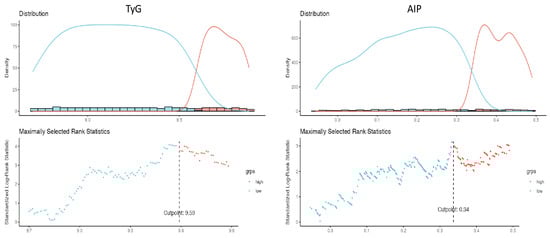 We employed maximally selected rank statistics to determine optimal cut-off points in the time-to-event data, thereby categorizing observations into two groups based on TyG and AIP for mortality estimation (TyG: low ≤ 9.59 vs. TyG high > 9.59, AIP: low ≤ 0.34 vs. high >0.34) (Figure 2). The cumulative hazard on the survival curve indicated a higher mortality rate in the high-TyG group (log-rank test, p-value < 0.001) (Figure 3). The model that exhibited the most robust predictive performance (as assessed by Likelihood ratio X2 and R2) and discrimination incorporated TyG as a continuous variable. The Harrel’s C-index of the full models, which included TyG continuous scores, was significantly higher than the AIP model (Table 5).