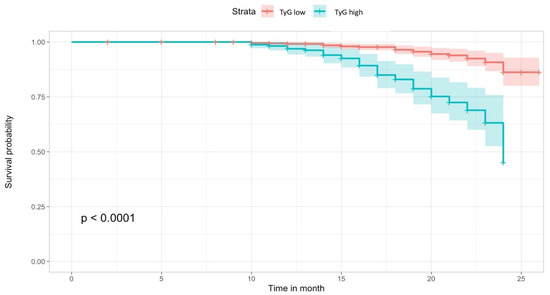 Throughout the follow-up period, the primary outcome, characterized by the occurrence of MACEs, was more frequently observed in the high-TyG group compared to the low-TyG group (18.7% vs. 3.8%, p < 0.001, respectively) (Figure 2). Additionally, patients with elevated TyG levels exhibited higher incidence rates of cerebrovascular events (2.7% vs. 0.7%, p < 0.001), hospitalization for heart failure (3.4% vs. 0.9%, p = 0.003), non-fatal myocardial infarction (MI) (5.3% vs. 0.7%, p < 0.001), non-cardiac mortality (3.4% vs. 0.4%, p < 0.001), and cardiac mortality (3.8% vs. 1.1%, p = 0.002) (Table 2).